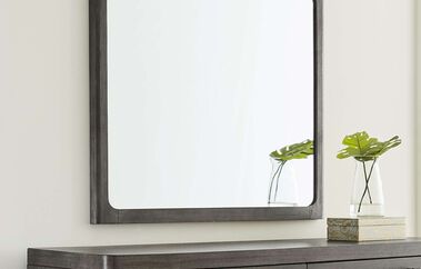 Large scaled contemporary meets traditional. Beautiful current finish that highlights wood texture and gives a definitive feel. Radius posts on all cases provide a soft sophisticated style. A winged fabric headboard dedicated to a traditional swag make this collection unique.